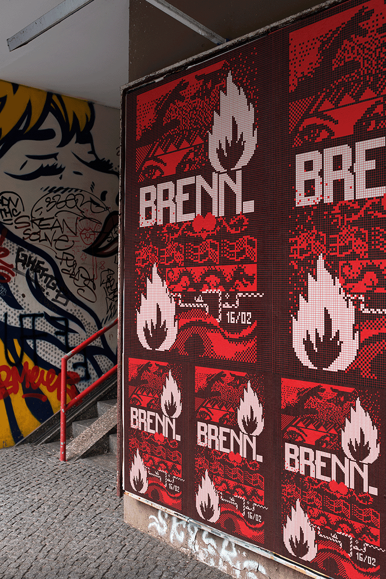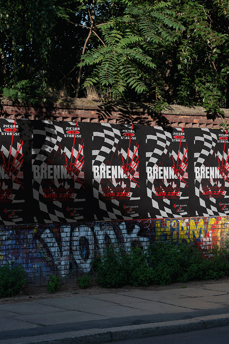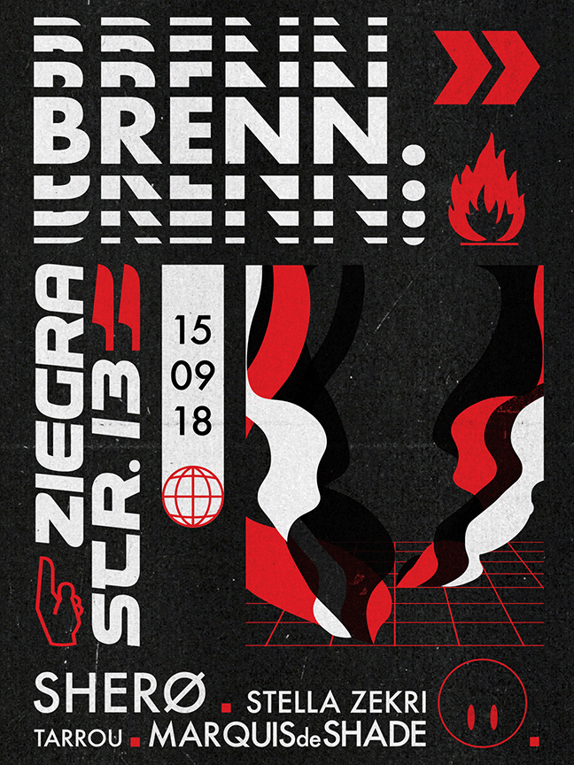 BRENN. is a Berlin party for which I created a handful of posters. The organisers asked for a visual aesthetic that took inspiration from 90s acid house posters. I created a loose iconography using their house colors red, white, and black, supplemented with bold lettering and the use of the smiley and a flame to build their visual identity.